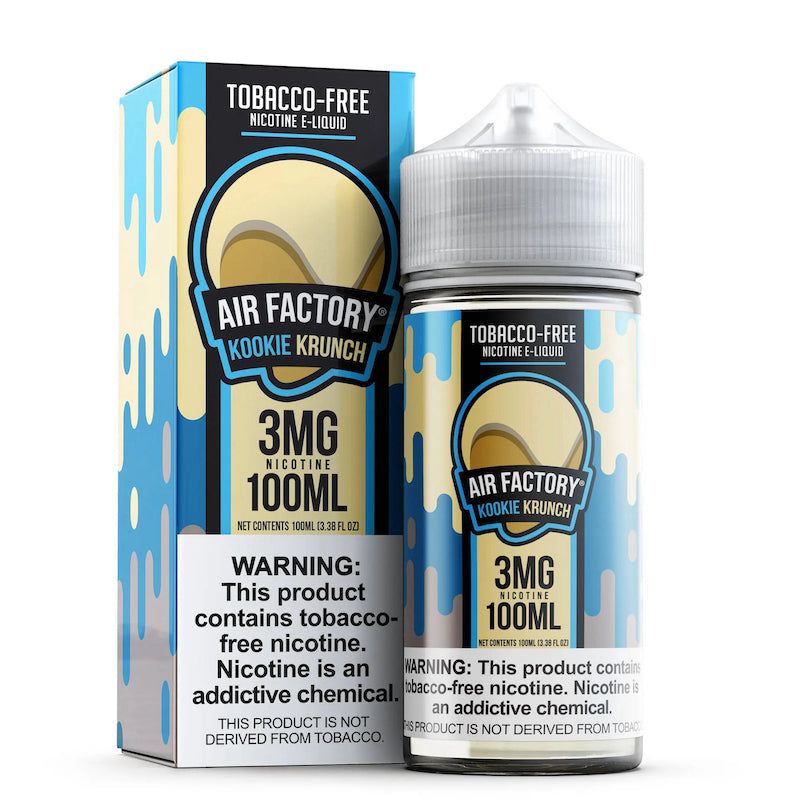 Kookie Krunch Air Factory Synthetic is a great cookie-inspired dessert vape. The crunch and scrumptious cookie flavor segue into a perfectly formulated max-VG e-liquid. The use of tobacco-free nicotine removes some of the harshness associated with regular freebase nicotine. Another advantage of synthetic nicotine is that it does not require industrial agriculture. Tobacco-derived nicotine is sourced from Big Tobacco and requires considerable acreage. But what really matters is the flavor. Kookie Krunch Air Factory is a top-notch e-juice.