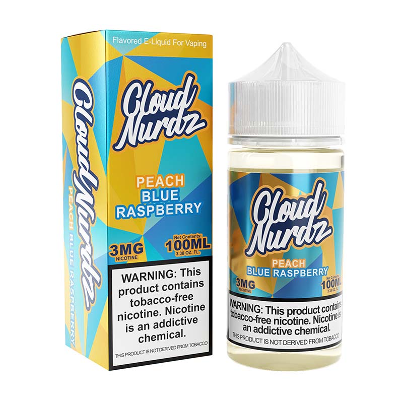 Peach Blue Raspberry Cloud Nurdz E-Liquid (TFN) uses Tobacco Free Nicotine (TFN) to extract every drop of flavor and satisfaction from this max-VG e-liquid. A sub-ohm tank and vape mod kit are the perfect way to enjoy billowing clouds of flavorful vapor. The peach is dripping with ripe notes and fuse beautifully with a bold blue razz flavor.