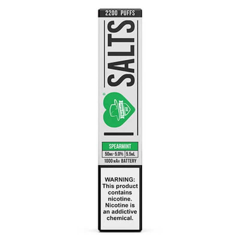 I Love Salts most popular flavor is now available in a longer lasting disposable vape pen. The federal ban on flavored prefilled vape pods removed the most popular flavor with adult vapers from the market. This flavor is of course mint and your wait for a perfect Juul Mint replacement is finally over. The Spearmint I Love Salts Disposable Vape Pen is exactly the cool and sweet mint vape that you have been waiting for. Mad Hatter has perfectly blended the chilly mint mouth feel with a blast of sweet spearmint. The best part is that it has never been so easy to enjoy Spearmint I Love Salts and each disposable has an e-liquid capacity that is over eight times larger than a Juul pod.