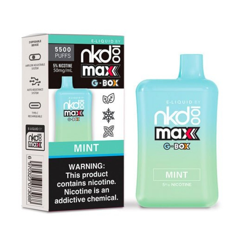 The Naked 100 Max G-Box Mint Disposable Vape features around 5500 puffs of fresh mint flavor at 5% nicotine salt strength. Stock up today!